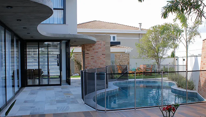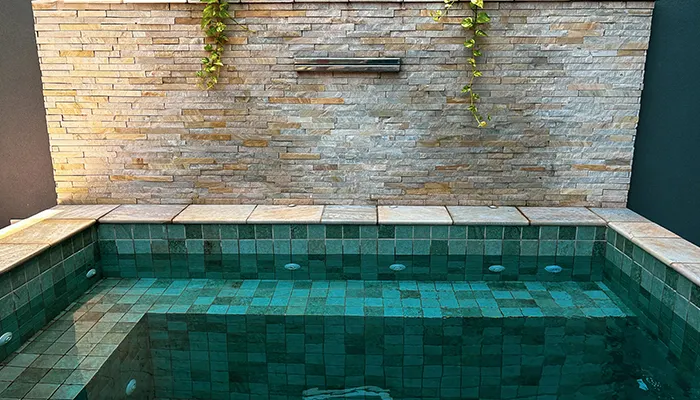 A pedra São Tome é indicada para áreas de piscinas por não reterem calor e serem antiderrapantes.